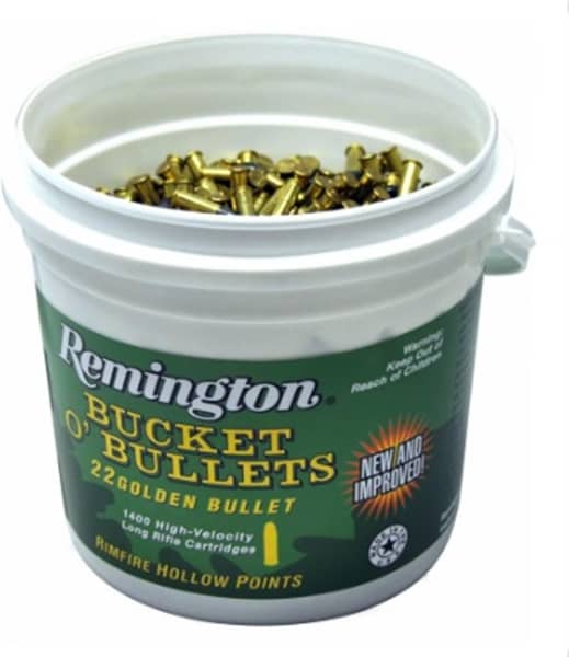 The bullets hard jackets will also help to keep your firearms barrel cleaner and in better working order. The Remington Bucket O Bullets. The bucket contains 1400 rounds of famous and field proven Remington Golden Bullet hollow point 22 ammunition.