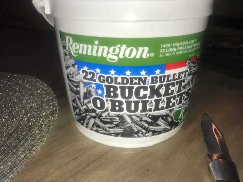 But before you can utilize Remingtons bucket youll have to fire all 1400 rounds of 22 LR that it comes filled with. Remington Bucket O Bullets Golden Bullet 22LR PHP 36 Grain 1400 Rounds 8074 Wolf 9mm FMJ 115 Grain 1000 Rounds 47499 TulAmmo 40 SW FMJ 180 Grain 250 Rounds 6649. Buy Remington Golden Bullet.